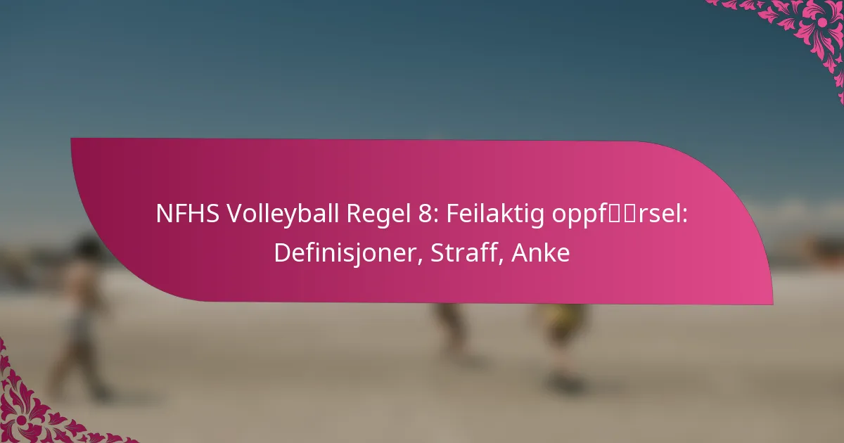 Feilaktig oppførsel i NFHS volleyball omfatter handlinger som bryter med spillets ånd og forstyrrer rettferdig spill. Straffene for slik atferd varierer i alvorlighetsgrad, fra advarsler til utvisninger, og er avgjørende for å opprettholde sportsånd. I tillegg finnes det en strukturert prosess for å anke avgjørelser om feilaktig oppførsel, som krever forståelse av spesifikke trinn og dokumentasjon for å sikre en rettferdig vurdering.